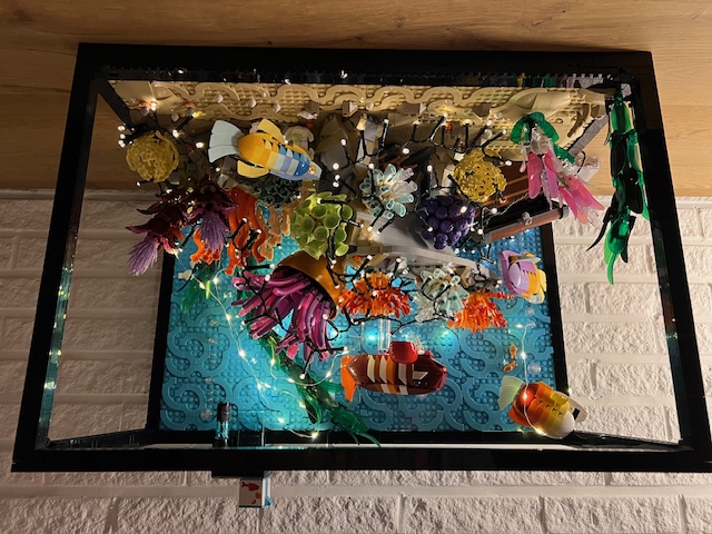 Zijn laatste werkstuk is een aquarium met vissen en planten en de nodige verlichting voor de sfeer. (foto) Toen ik er was stond er ook een winterlandschap met trein op de kast deze wordt enkel met eindejaar opnieuw boven gehaald.